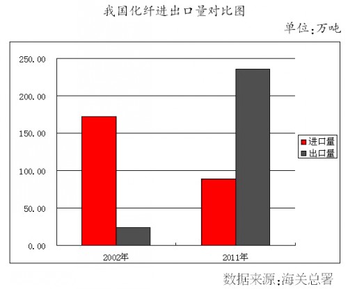 化學纖維在紡織原料中的利用比重繼續擴大,2011年化纖在纖維加工總量中所占比重達到73%,;化纖產品品種質量也不斷優化,2011年差別化率達到50%。在棉花等天然纖維價格大起大落的情況下,化纖行業對于保障紡織原料供給,促進紡織產業鏈平穩運行起到重要作用。