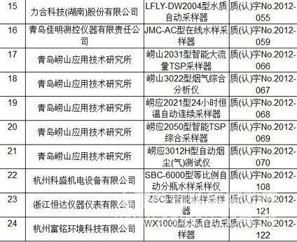 2013年1月7日,中國環(huán)境檢測總站公布截止2012年12月31日的采樣器及其他類儀器設(shè)備認(rèn)證檢測合格產(chǎn)品名錄,武漢市天虹儀表有限責(zé)任公司的TH-1000型大流量空氣總懸浮微顆粒采樣器、聚光科技(杭州)股份有限公司的AS-3000型水質(zhì)自動采樣器、青島佳明測控儀器有限責(zé)任公司的JMC-AC型在線水樣采樣器等24個產(chǎn)品在列。