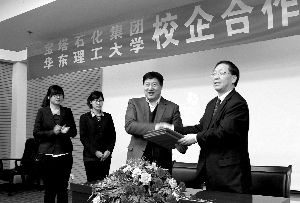 1月28日,寧夏寶塔石化集團和華東理工大學召開技術交流會并達成校企合作共識。會上,雙方就油品在線自動調和技術等11個合作項目進行了討論,并現場簽訂了合作協議。據了解,華東理工大學每年還為寶塔石化集團委培工程碩士10名、本科生10名。圖為寶塔集團副總裁張立忠(右二)和華東理工大學副校長錢鋒(右一)簽訂協議。