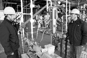 3月1日,獨(dú)山子石化公司統(tǒng)計(jì)顯示,乙烯廠今年2個月節(jié)約天然氣4400多噸,生產(chǎn)甲醇5800多噸。該公司乙烯廠通過技術(shù)改造,回收富余生產(chǎn)廢氣,供甲醇裝置作原料,不但保護(hù)了環(huán)境,而且增加了經(jīng)濟(jì)效益。 圖為乙烯廠甲醇裝置員工正在檢查設(shè)備的壓力。