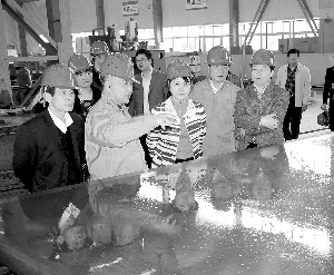 日前,益陽(yáng)橡膠塑料機(jī)械集團(tuán)有限公司開(kāi)發(fā)出目前國(guó)內(nèi)最大的16m×3.2m平板硫化機(jī),使膠帶硫化時(shí)質(zhì)量更好、效率更高、更節(jié)能。圖為公司董事長(zhǎng)兼總經(jīng)理張俊山(左二)向益陽(yáng)市委書(shū)記(左三)魏旋君一行介紹新開(kāi)發(fā)的超大規(guī)格平板硫化機(jī)關(guān)鍵部件熱板。