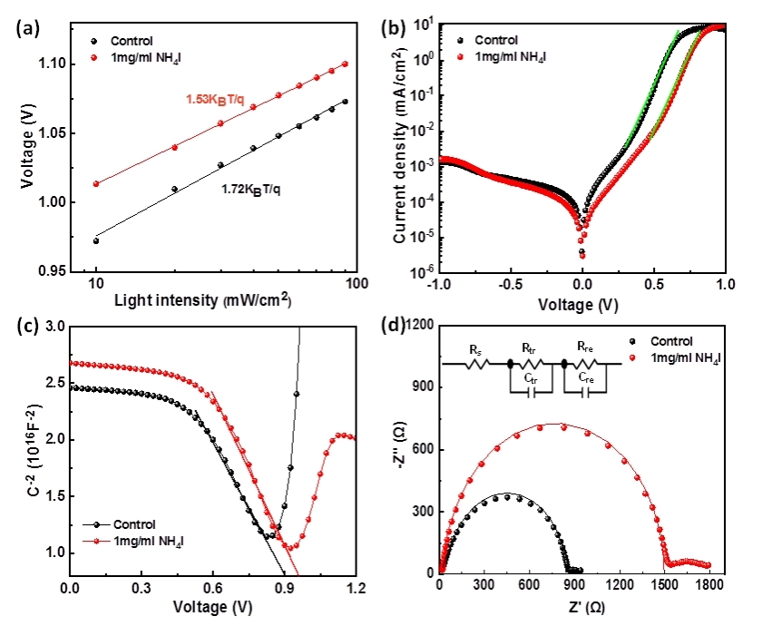 鍥?/span>4. 錛?/span>a錛夊姞鍏?/span>NH4I鍓嶅悗鐨勫紑鍘嬮殢鍏夊己鍙樺寲鐨勬洸綰垮浘銆?/span>NH4I澶勭悊鍓嶅悗鐨勬殫鎬?/span>J-V錛?/span>b錛夛紝Mott?Schottky錛?/span>c錛夛紝EIS錛?/span>d錛夊姣斿浘銆?/span>