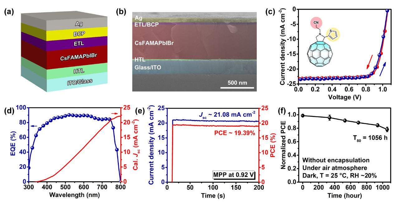 鍥? (a)閽欓挍鐭垮お闃寵兘鐢墊睜鐨勭粨鏋勭ず鎰忓浘錛?b)鍣ㄤ歡鐨勬壂鎻忕數闀滄埅闈㈠浘錛?c)鏈浼樺櫒浠剁殑J-V姝e弽鎵洸綰匡紱(d)鏈浼樺櫒浠剁殑澶栭噺瀛愭晥鐜囨洸綰匡紱(e)鏈浼樺櫒浠跺湪鏈澶у姛鐜囩偣涓嬬殑紼蟲佽緭鍑烘洸綰匡紱(f)鏈浼樺櫒浠剁殑紼沖畾鎬ф祴璇曘?br />