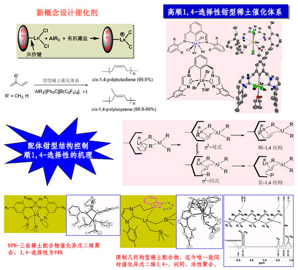 共軛雙烯烴可以進(jìn)行順式1,4-、反式1,4-、1,2-(或3,4-)等區(qū)域選擇性聚合,以及1,2-(或3,4-)間同、全同、無(wú)規(guī)等區(qū)域、立體選擇性聚合,得到結(jié)構(gòu)變化多樣的聚合產(chǎn)物。其中高順式1,4-聚異戊二烯和聚丁二烯是工業(yè)、國(guó)防和航天應(yīng)用最廣泛的橡膠。而反式1,4- 1,2-或3,4-聚雙烯烴是醫(yī)用、或高性能橡膠的重要組分。生物體系的選擇性在溫和條件下可以達(dá)到100%,比如天然橡膠中異戊二烯的順式1,4-結(jié)構(gòu)可達(dá)100%,但對(duì)于合成催化劑實(shí)現(xiàn)97%以上就非常困難。然而結(jié)構(gòu)的細(xì)微差別會(huì)導(dǎo)致產(chǎn)物性能的極大變化。因此開(kāi)發(fā)易合成、高催化活性、選擇性、適于工業(yè)化生產(chǎn)的催化體系,一直是學(xué)術(shù)界特別是工業(yè)界非常具有吸引力而又十分棘手的課題之一。我們采用新的催化劑設(shè)計(jì)理念,合成了一系列高選擇性催化體系,并研究了選擇性控制機(jī)理。