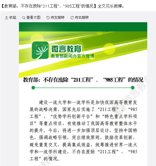 教育部新聞辦公室官方微博“微言教育”今日發(fā)布微博表示,建設(shè)一流大學(xué)和一流學(xué)科是加快我國(guó)高等教育發(fā)展的戰(zhàn)略決策。國(guó)家先后實(shí)施了“211工程”、“985工程”、“優(yōu)勢(shì)學(xué)科創(chuàng)新平臺(tái)”和“特色重點(diǎn)學(xué)科項(xiàng)目”等重點(diǎn)項(xiàng)目,有效推動(dòng)了我國(guó)高等教育整體水平的提升。今后,將進(jìn)一步加強(qiáng)頂層設(shè)計(jì),避免重復(fù)交叉,提高集成效益,統(tǒng)籌推進(jìn)世界一流大學(xué)和一流學(xué)科建設(shè),不存在廢除“211工程”、“985工程”的情況。
