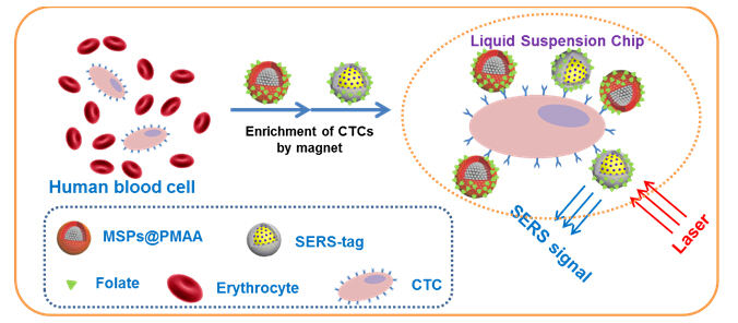 汪長春教授課題組開發了一種可用于CTCs檢測的新技術。他們合成了一種高度均勻的核殼結構的磁性復合微球,該磁性復合微球以具有高磁響應能力的磁性納米晶簇為核心、葉酸修飾的聚甲基丙烯酸為殼層,能穩定懸浮在水溶液中,成為一個新型的“懸浮捕獲基質”。通過葉酸和HeLa細胞表面過表達的葉酸受體的相互識別作用,“懸浮捕獲基質”能在細胞分散液中特異地將HeLa細胞捕獲,并且在外界磁場的作用下能迅速將其分離出來;同時,也可以通過用谷胱甘肽降解聚甲基丙烯酸殼層的方法將捕獲到的靶細胞從“懸浮捕獲基質”上洗脫下來,從而完成對靶細胞進行回收和檢測。在此基礎上,汪長春教授課題組還用SERS編碼微球作為檢測標簽微球,與“懸浮基質微球”以及靶細胞組成懸浮芯片,能在分離的過程中將編碼微球共吸附在靶細胞上,進而能直接通過拉曼光譜來檢測靶細胞是否存在于血液中。此懸浮芯片制備方法簡單、能快速分離和檢測靶細胞,可實現在1mL含有20個左右靶細胞的血液樣本中快速檢測到目標細胞,該項研究結果為此項技術的臨床應用奠定了重要基礎。