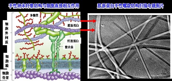 基于上述手性自組裝體,進一步揭示了手性納米纖維調控細胞粘附、生長的規律及機理,首次報道了左旋納米纖維可大大促進細胞的粘附、生長,右旋環境中則抑制細胞的粘附、生長。并通過研究細胞膜基質蛋白與手性納米纖維的相互作用,揭示了基質蛋白介導細胞粘附、生長的機理。此研究對構建仿生手性微納米結構提供了理論基礎和新思路,初步解決了手性納米纖維調控細胞粘附、生長等基礎科學問題,相關研究發表在Angew. Chem. Int. Ed. 2014, 53, 7789-7793。