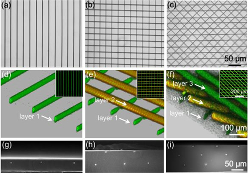 在以上研究基礎上,他們通過在可聚合液態基材上打印含有納米顆粒的導電墨水,巧妙地利用液態基材對打印墨滴的動態包裹作用,實現了高精度嵌入式導電銀線的直接制備。由于噴墨打印導電墨水粘度和表面張力的影響,實現其在另一種液體內部融合成線非常具有挑戰性。他們通過調控液態基材的流變行為和納米銀導電墨水的性質解決了這一問題,實現了液態基材對墨滴的可控包裹,有效抑制了墨滴的擴散和“咖啡環”效應(圖1)。基此,利用噴孔孔徑為25μm的普通商用打印機制備了線寬約1-2 μm的導電銀線,比通常的噴墨打印精度提高了約20倍。所制備的高精度電路直接嵌入在基材內部,避免了后續的封裝步驟。電學測試表明這種方法制備的嵌入式微型電纜具有優異的導電性能。他們進一步利用這種“液膜嵌入式打印”,采取逐層疊加的方式直接打印實現了多層電路的制備,達到了60μm透明薄膜內嵌入三層電路的集成度(圖2)。