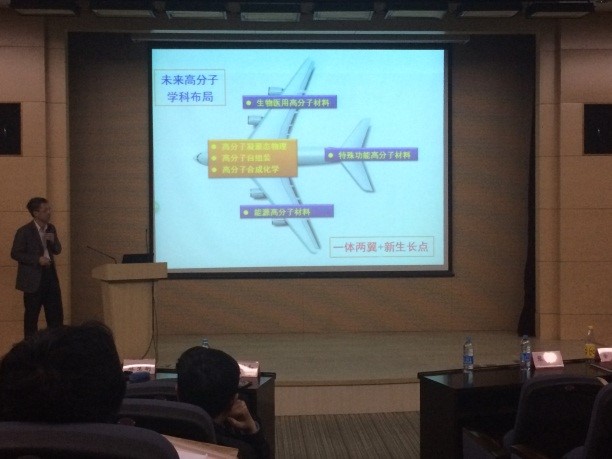 晚上,四個院系分別作本學科發展規劃匯報,高分子系系主任汪長春代表發言。匯報后,學校領導及兄弟院系的老師們對高分子系人才引進、研究成果轉化等方面提出了建議和意見,與老師們進行了充分的交流及探討。第一天的會議反響熱烈,各院系集體討論,交流學習,增進了解。