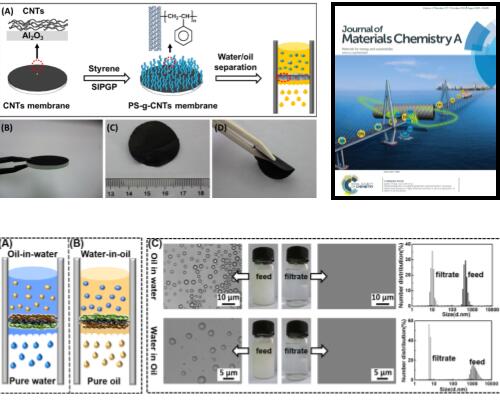 中科院寧波材料所高分子事業部陳濤研究員的智能高分子材料團隊長期致力于二維高分子納米復合油水分離材料的研究,通過表面接枝高分子刷和多級組裝技術,獲得多種新型復合材料,可實現高效分離油水乳液和凈化水質。科研人員采用多孔陶瓷作為襯底,抽濾納米碳管(CNTs)成膜,采用自引發的光接枝光聚合(self-initiated photografting and photopolymerization,SIPGP)的方法接枝疏水性的高分子聚苯乙烯(PS)到CNTs的表面,進而協同利用CNTs薄膜的高粗糙度表面,獲得超疏水性的二維雜化薄膜材料。該膜可用于微米和納米級油包水乳液的大通量、高效分離(J. Mater. Chem. A, 2014, 2, 15268-15272,圖1上,內封面)。在此基礎上,將得到的超疏水性的PS/CNTs薄膜反轉并轉移到另一個基底上,再次通過SIPGP將親水性的聚甲基丙烯酸二甲胺乙酯(PDMAEMA)單向接枝到CNTs膜的表面,從而得到具有親水/疏水結構的雙面(Janus)復合薄膜(PDMAEMA/CNTs/PS),實現對油包水和水包油乳液進行選擇性分離的效果(ACS Appl. Mater. Interfaces, 2014, 6, 16204,圖1下)。針對現有油水分離材料不耐腐蝕的問題,該團隊在CNTs表面接枝修飾較低表面能的全氟癸基三乙氧基硅烷(PFDTS),從而簡便制備了形貌、流速可控的PFDTS/CNTs 薄膜,實現高效、快速的乳化油水分離。該薄膜具有較好的耐酸堿、耐高溫低溫和阻燃性能,為提高油水分離材料的實用性奠定了良好的基礎(J. Mater. Chem. A, 2015, 3, 4124)。
