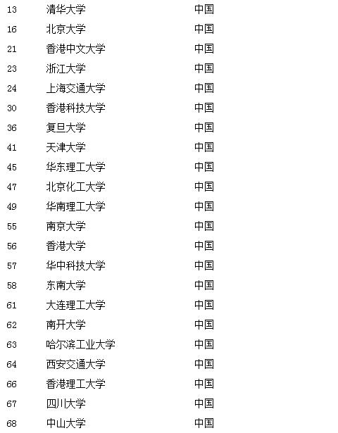 東北亞以外排名最高的大學是新加坡國立大學(排名第 11)。 排名最高的中國大學是清華大學(排名第 13), 北京大學(排名第 16)則是另一所躋身前 20 強的中國大學。 在總體上,中國有 22 所大學上榜,包括來自中國大陸的18所大學和香港地區的4所大學,是上榜大學數量最多的國家。
