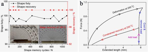 圖1. 聚酰亞胺循環折疊-恢復過程中的形狀記憶效應(a),在250 °C時的拉伸能和存儲能(b).