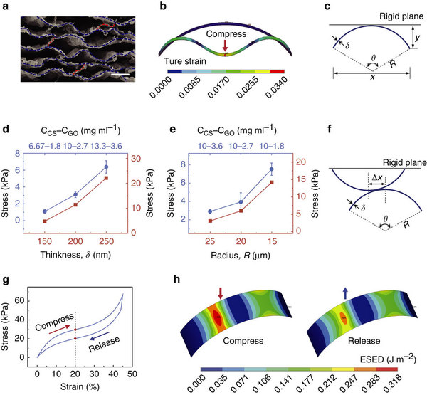 (a) C-G 彈性體薄層之間的鏈接細(xì)節(jié);(b) 理論模擬顯示該材料的結(jié)構(gòu)單位模型薄殼結(jié)構(gòu)在發(fā)生大變形時(shí)其內(nèi)部具有很小應(yīng)變;(c) 分析該結(jié)構(gòu)單元彈性性能的結(jié)構(gòu)模型;(d) 具有不同層厚的C-G 彈性體(藍(lán)色)及薄殼模型(紅色)的壓縮應(yīng)力;(e) 有不同收縮程度的C-G 彈性體(藍(lán)色)及不同半徑的薄殼模型(紅色)的壓縮應(yīng)力;(f) 分析相鄰拱單元之間摩擦情況的結(jié)構(gòu)模型;(g) 理論模擬得到的交錯(cuò)的拱單元之間相互擠壓時(shí)的應(yīng)力應(yīng)變曲線;(h) 理論模擬得到的對(duì)應(yīng)(g)中20%應(yīng)變時(shí)模型的能量分布情況。
