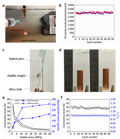 圖2 復合纖維的扭轉和提拉致動性能測試。(a) 激光位移傳感器記錄槳葉的扭轉運動; (b) 扭轉致動的循環(huán)穩(wěn)定性測試; (c) 玻璃片限制槳葉扭轉 ; (d) 復合纖維提拉自身重量~ 11,309倍的重物,最大應變 ~ 9.4% ; (e) 復合纖維的提拉應變和功率密度隨槳葉質量的變化關系; (f) 提拉致動的循環(huán)穩(wěn)定性測試。