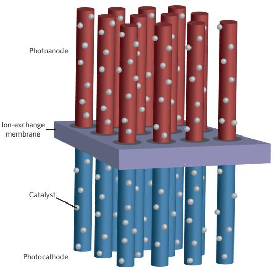 該系統中,光電極為微米線陣列,隔膜由柔性聚合物。光電陽極材料吸收藍色光進行水氧化,光電陰極吸收紅色光,滿足水還原或者CO2還原。光電陰極和陽極材料歐姆接觸,并都修飾上相應的納米催化劑。兩個光電極之間的膜用于離子傳遞和產物分離。