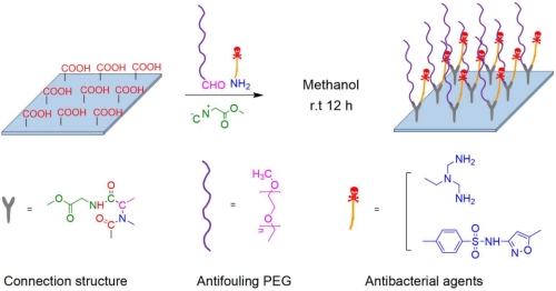 面對日益嚴峻的水資源緊缺現狀,反滲透(RO)已成為主流的水處理技術。然而,膜污染一直是影響反滲透技術進一步發展以及制約其運營成本的一大障礙。針對上述問題,孟建強教授課題組嘗試通過多組分反應在RO膜表面進行多功能修飾,一步反應同時將抗污染成分和抗菌成分引入膜表面,有效抑制有機污染、無機鹽污染和生物污染,制備抗菌抗污染的反滲透膜。他們以商品化的芳香聚酰胺族(PA)RO復合膜為研究對象,利用其表面含有大量羧基這一結構特點,在其表面進行Ugi-4CR(烏吉四組分反應):以RO膜作為羧基組分;親水性大分子醛基化聚乙二醇單甲醚(CHO-MPEG)作為醛基組分;帶有端氨基的抗菌劑三(2-氨乙基)胺(TAEA)或磺胺甲惡唑(SMZ)作為氨基組分;廉價的異氰基乙酸甲酯作為異氰組分。在室溫條件下,以甲醇為溶劑,將等物質的量的其他三組分與RO膜反應,一步反應同時在膜表面接枝親水性分子和抗菌劑,可以有效抑制水中的有機物、無機鹽以及微生物污染。這種方法既擴大了污染物的抑制范圍,同時簡化了反應步驟和條件。修飾后的RO復合膜在過濾BSA和高硬度無機鹽水溶液時,滲透通量衰減率遠遠低于原膜,短時間清洗后恢復率也顯著提高,除此之外,在與細菌培養時,細菌濃度較原膜明顯減少,抑菌率高達98%以上。與目前文獻中常規的一步反應只能完成單一組份修飾的方法相比,操作簡便,條件溫和,兼顧高效性和經濟性的優勢。