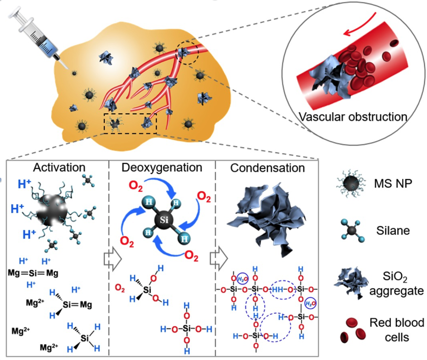 實(shí)驗(yàn)結(jié)果顯示,該新型耗氧劑在腫瘤組織弱酸性微環(huán)境下被特異性激活,利用中間產(chǎn)物硅烷(SiH4)快速高效、持久消耗腫瘤組織及血管中的溶解氧和血紅蛋白結(jié)合氧,導(dǎo)致腫瘤病灶區(qū)極度缺氧;更重要的是,耗氧劑的分解產(chǎn)物SiO2在腫瘤組織血管中原位自聚集形成微米級(jí)絮狀物,高效率阻塞腫瘤血管,切斷腫瘤周圍的氧分子和營(yíng)養(yǎng)成分通過腫瘤血管系統(tǒng)的供給,同時(shí)也切斷了腫瘤侵襲、轉(zhuǎn)移的血管途徑,致使癌細(xì)胞發(fā)生明顯的纖維化、凋亡和壞死,達(dá)到“餓死腫瘤”的治療效果;值得一提的是,該策略采用的制備工藝可以批量化、低成本制備硅化鎂耗氧劑,并僅能在腫瘤病灶區(qū)特異性激活其耗氧功能,正常組織和器官中無法激活其耗氧功能,該類不含有重金屬離子的新型耗氧劑,不但自身具有良好的生物相容性,其分解產(chǎn)物(Mg2+和SiO2)同樣也無毒無害,并最終被安全地代謝出體外,克服了醫(yī)用無機(jī)材料難降解、活體內(nèi)滯留易導(dǎo)致生物毒性的醫(yī)學(xué)難題。該工作為批量化制備新型功能納米材料提供了新的方法,同時(shí)為“腫瘤饑餓療法”提供了新的思路。