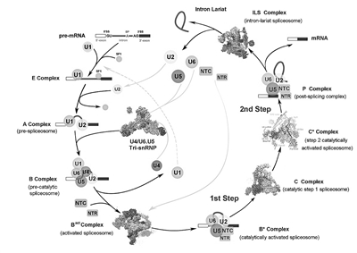 RNA剪接是地球上所有真核生物從DNA到蛋白質信息傳遞這一“中心法則”的關鍵一環。通過剪接反應,前體信使RNA中的內含子被剔除、外顯子連接起來形成成熟的信使RNA,進一步才能被翻譯成蛋白質。人類已知的遺傳疾病中大約35%是由RNA剪接的異常導致的。RNA剪接的化學本質是前體信使RNA經歷兩步轉酯反應完成剪和接兩個關鍵步驟,每一步都需要由一個巨大的動態分子機器——剪接體來催化完成。因此,獲取分子量達兩百萬道爾頓以上的剪接體在組裝、激活、催化反應過程中各個狀態的高分辨率空間三維結構是理解RNA剪接分子機制的必經之路,也是結構生物學界最富挑戰性的課題。過去30年,這一生命科學基礎研究的核心領域進展緩慢。清華大學生命科學學院施一公實驗室針對這一重大科學難題,創新性地利用酵母內源性蛋白提取獲得了性質良好的樣品,并利用單顆粒冷凍電子顯微鏡技術,繼2015年率先報道裂殖酵母剪接體的結構之后,在2016年取得重大突破,相繼解析了3個關鍵工作狀態下剪接體的近原子分辨率結構(即3.5埃的激活狀態剪接體Bact complex、3.4埃的第一步催化反應后復合物C complex以及4.0埃的第二步催化激活狀態下的C* complex)以及一個剪接體組裝過程中重要復合物的高分辨率結構(即3.8埃的預組裝復合物U4/U6.U5 tri-snRNP)。這4項進展均以長文的形式先后發表在2016年的《科學》周刊上(Science 351:466-475; 353:895-904;353:904-911; aak9979)。這4個高分辨率結構所代表的剪接體狀態,基本覆蓋了RNA剪接的關鍵催化步驟,從分子層面解釋了剪接體執行RNA剪接的機制,極大地推動了RNA剪接這一基礎研究領域的發展。