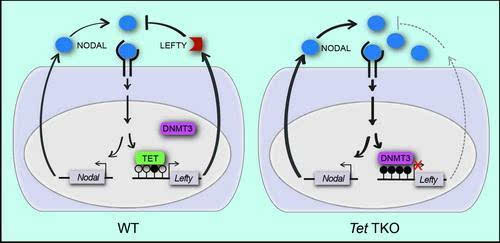 動植物從單細胞受精卵發育成為高度復雜的生物體是一個奇妙的過程。哺乳動物基因組DNA中的5-甲基胞嘧啶作為一種穩定存在的表觀遺傳修飾,由DNA甲基轉移酶(DNMTs)催化產生。近年研究發現,TET雙加氧酶家族蛋白(TET1/2/3)可以氧化5-甲基胞嘧啶,引發DNA去甲基化。雖然DNA甲基化在哺乳動物基因印記和X染色體失活等生命活動過程中參與基因表達的調控,但是DNA甲基化以及TET雙加氧酶介導的去甲基化在小鼠胚胎發育過程中究竟起什么作用還不清楚。中國科學院上海生物化學與細胞生物學研究所徐國良研究組與美國威斯康星大學孫欣、北京大學湯富酬等合作,利用生殖系特異性敲除小鼠得到Tet基因三敲除胚胎,通過一系列形態發育特征的檢測,結合基因功能互補分析,解析了TET缺失造成胚胎死亡的機制,發現了TET三個成員之間功能上相互協作,介導的DNA去甲基化與DNMT介導的DNA甲基化相互拮抗,通過調控Lefty-Nodal信號通路控制胚胎原腸運動。該工作從長期困擾發育生物學領域的基本重大問題出發,著眼于人類新生兒出生缺陷的可能機理和防治,第一次系統地揭示了胚胎發育過程中關鍵信號通路的表觀遺傳調控機理,為發育生物學的基本原理提供了嶄新的認識。相關研究論文發表在2016年10月27日《自然》(Nature[538:528—532])上。
