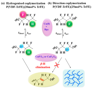 近日,西安交通大學理學院張志成課題組在《英國皇家化學學會·聚合物化學》(RSC Polymer Chemistry)在線發表了《通過可控原子轉移自由基消除反應活化C-F在P(VDF-TrFE)中引入-CH=CH-》(Inserting -CH=CH- into P(VDF-TrFE) by C-F Activation Mediated with Cu(0) in a Controlled Atom Transfer Radical Elimination Process)研究論文,利用銅粉(Cu)與配體(聯吡啶,Bpy)體系對P(VDF-TrFE)鐵電聚合物中的TrFE上的C-F鍵進行選擇性活化,利用產生的自由基和鄰碳上的C-H鍵進行b-H消除反應,在PVDF聚合物鏈中引入-CH=CH-內雙鍵。