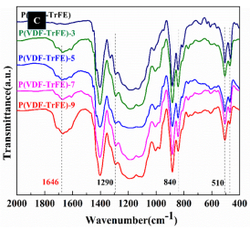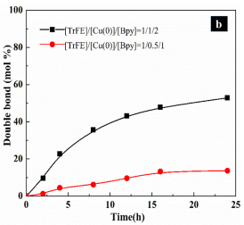 通過調節催化劑含量,雙鍵含量可以可控改變,反應表現出良好的一級反應動力學特征。雙鍵的引入可以被核磁、紅外等詳細表征。與其它大位阻第三單體(如三氟氯乙烯CTFE, 六氟丙烯HFP,氟氯乙烯CFE等)不同的是,雙鍵的引入不影響P(VDF-TrFE)主鏈的b-晶型,而只會降低其總體的結晶度,且對其鐵電-順電相變(F-P)溫度影響很小。