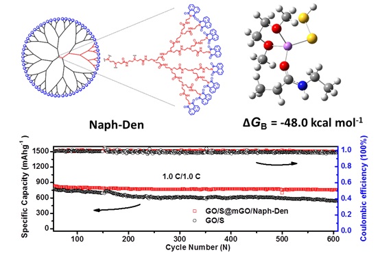 最近,他們發展了一種超薄氧化石墨烯與與聚酰胺-胺型樹枝狀高分子的復合膜,用于硫正極的保護,有效提高了鋰/硫電池的長循環穩定性(圖2)。該保護膜是將氧化石墨烯與高分子材料相融合制成凝膠狀材料,涂抹在硫正極表面,形成100 nm左右的薄膜,并且由于該薄膜輕薄的特質,其對電池的能量密度幾乎沒有任何影響。更重要的是,這種復合薄膜幾乎可以與任何硫正極相融,達到保護硫正極的效果,例如二茂鐵與多孔碳的復合物作為基底材料的硫正極(J. Mater. Chem. A, 2017, accepted)。部分工作于2017年3月20日在線發表于PNAS上(DOI:10.1073/pnas.1620809114 )。
