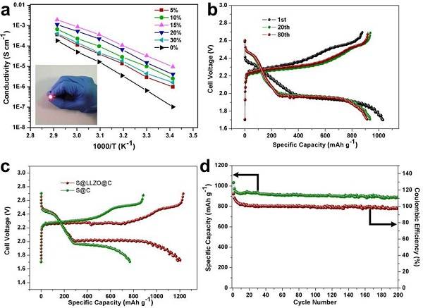 (a)具有不同LLZO濃度的納米復合材料LLZO-PEO-LiClO4的導電性;(b)在37℃下具有0.05mA cm-2的固化密度的S@LLZO@C正極的第1,第20和第80個循環的典型充電/放電曲線;(c)在50℃下具有0.1mA cm-2的S@LLZO@C和S@C正極的典型充電/放電曲線;(d)在37℃下電流密度為0.05mA cm-2的S@LLZO@C陰極的循環性能和庫侖效率