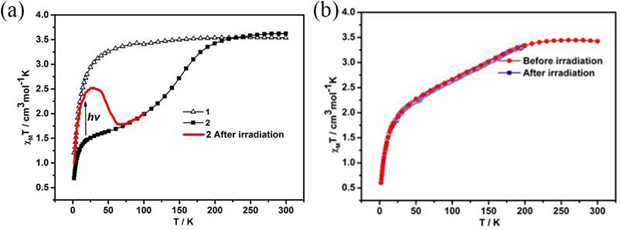 圖2 (a) 配位聚合物1,2和光激發2的變溫磁化率曲線 (b) 2@I2光激發前后的變溫磁化率曲線