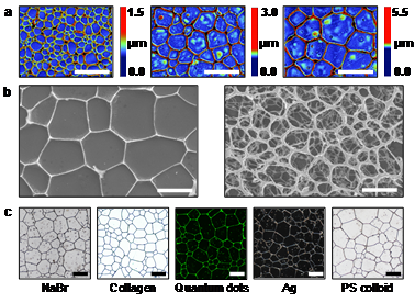 由于冰晶疇尺寸在大范圍內可調,而冰重結晶是動力學穩定態過程,所以冰重結晶為冰模板法可控制備兩維和三維多孔材料提供了新的方法。圖3顯示以重結晶后的冰晶為模板,將高分子、量子點和高分子膠體粒子組裝成孔徑可調的2D和3D材料。該工作發表在《自然—通訊》上(Nat. Commun., 2017, 8, 15154,.)。