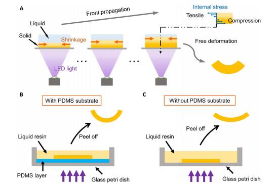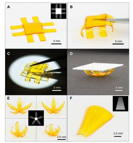這一技術將明暗形狀的灰度圖投影到盤子上或者兩塊載玻片中間的液體丙烯酸鹽聚合物薄層上。混入聚合物中的光引發劑材料受到尋常的LED投影燈的照射,啟動交聯反應,形成固態薄膜。聚合物浸染的光吸收劑起到光線調控作用。由于光固化過程中聚合物網絡演變和體積收縮之間的復雜反應,聚合物中接受光線較少的區域更容易彎曲。