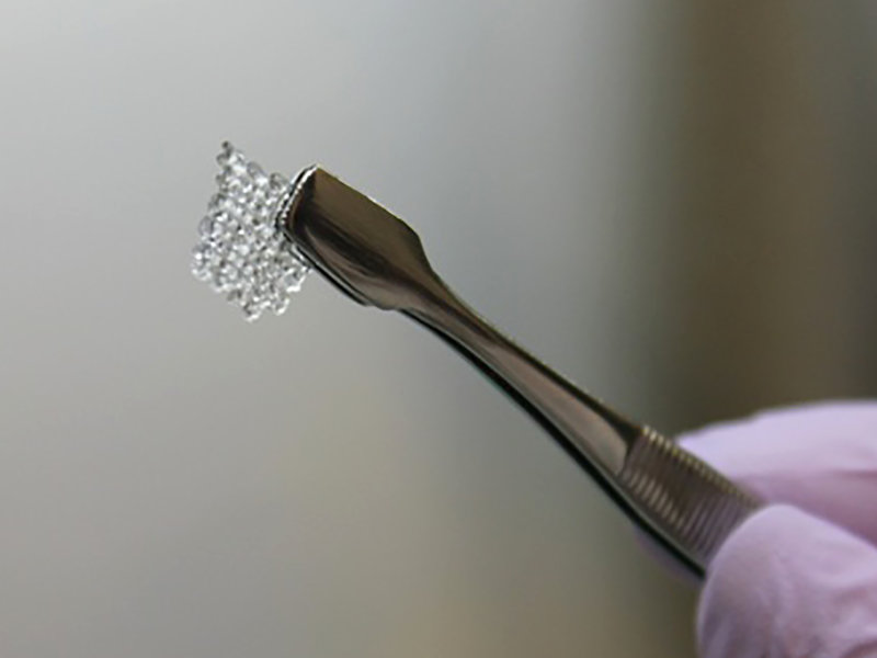 科學(xué)家用鑷子夾著一片凝膠狀的小鼠卵巢生物假體。