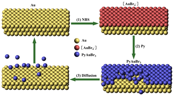 針對這一挑戰,陜西師范大學“光子鼻與分子材料”創新團隊楊鵬教授于2012年發現一類新的Au氧化反應,即DNA中堿基的類吡啶結構可以與三價Au離子形成有效配合物,從而降低Au的氧化能壘,實現在室溫中性溫和水溶液中的高效Au氧化和刻蝕(需加入少量弱氧化劑NBS, N-溴代丁二酰亞胺引發氧化反應),相關成果發表在Chem. Commun.上(Chem. Commun. 2012, 48, 8787)。基于此成果,在國家自然科學基金委的支持下(nos. 21374057, 51303100, 51673112),楊鵬課題組于2014年進一步闡明其刻蝕機理,發現其本質就是NBS和類吡啶結構(如生物大分子DNA或者小分子吡啶試劑)對Au的協同氧化刻蝕機制(Langmuir 2015, 31, 2922)。