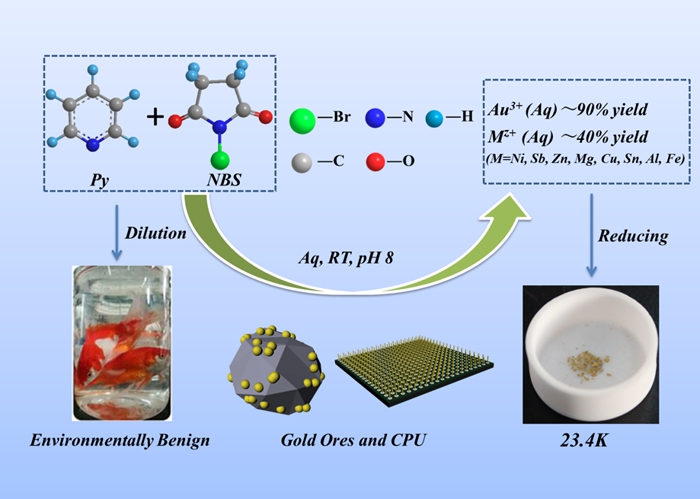 在以上工作基礎之上,楊鵬課題組于2014年開始嘗試使用此類原創性化學方法來實現對低品味金礦和電子垃圾中Au的高效回收,期待為解決關乎國計民生的重大問題而提供一些有益思路。近日,楊鵬課題組在國際頂尖化學類期刊《德國應用化學》上報道了最新研究成果(Angew. Chem. Int. Ed. 2017, DOI: 10.1002/anie.201703412),并被遴選為Hot Paper。在此工作中,為降低成本從而真正實現大規模應用,他們直接使用NBS和吡啶(Py)的室溫中性水溶液對低品味金礦和電子垃圾中的Au進行高效提取,發現該體系可以取代傳統的劇毒氰化物和高濃度強酸體系而取得更加高的提取效率,成本卻低很多,細胞和生物毒性也極大降低,從而有望解決目前從低品味金礦和電子垃圾中提取Au所面臨的巨大的環境污染和高能耗問題,為采礦工業和處理電子廢料提供了一種新策略,為可持續發展循環經濟提供了現實的參考和指導。該論文第一作者為楊鵬教授指導的碩士研究生樂春林。該工作還得到了西北工業大學生命學院鄧旭東老師和天津醫科大學張旭老師的特別支持,他們也是本工作的合作者。陜西師范大學化學化工學院,應用表面與膠體化學教育部重點實驗室為該工作的第一單位及唯一通訊作者單位。
