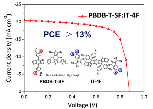 近期,在中國科學院和國家自然科學基金委的支持下,中科院化學所高分子物理與化學實驗室的研究人員同時對OSCs中給、受體材料進行了優(yōu)化,并基于此制備了OSCs,實現(xiàn)了超過13%的PCE,該效率是目前OSCs領(lǐng)域報道的世界最高結(jié)果(J. Am. Chem. Soc. 2017, 139, 7148–7151)。他們將氟原子分別引入到聚合物給體PBDB-T和非富勒烯受體ITIC上,設(shè)計合成了新型的給、受體PBDB-T-SF和IT-4F(如圖1所示)。新型給、受體材料的吸收性能比原來有明顯的提高,使得相應OSCs的短路電流密度有了大幅的提升,獲得了13%的PCE,并得到了中國計量科學研究院的認證。此外,該OSCs可以在較寬的膜厚范圍內(nèi)和較長時間的存儲中保持優(yōu)異的性能,這對OSCs的實際應用具有重要的意義。