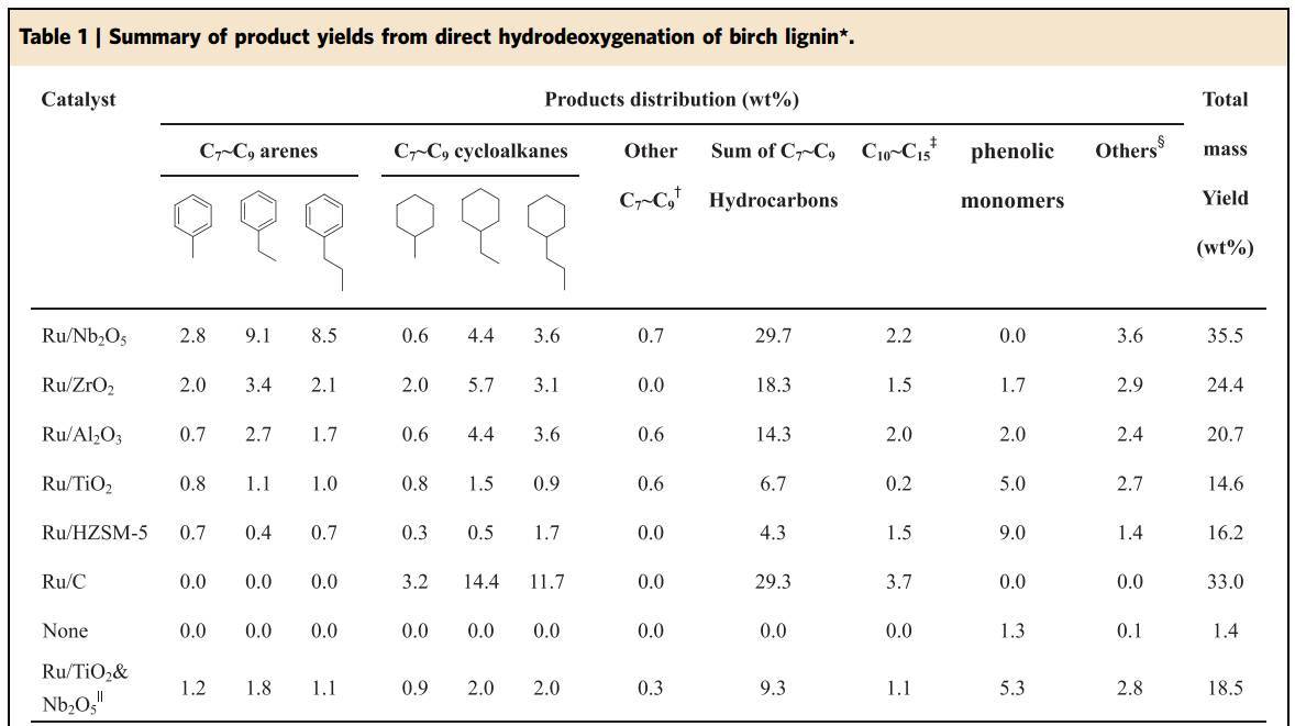 圖2. 木質(zhì)素在2%Ru/Nb2O5等催化劑上氫解反應(yīng)結(jié)果。