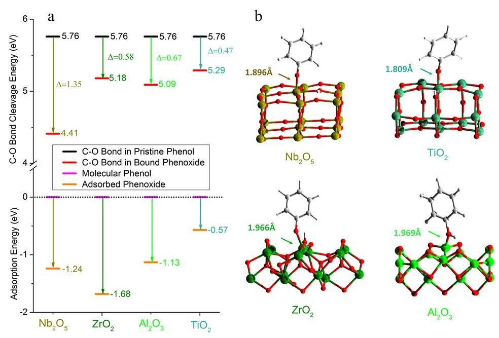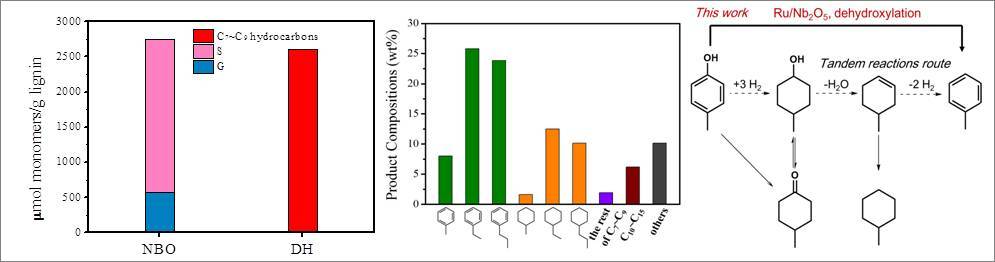 Ru/Nb2O5催化劑表現(xiàn)出了優(yōu)異的催化活性,酚類化合物吸附在Nb2O5上,活化酚羥基的C-O鍵,在Ru和Nb2O5協(xié)同作用下,高選擇性轉(zhuǎn)化得到芳香烴。該成果提供了一種簡單、高能效的新途徑,將木質(zhì)素轉(zhuǎn)化為有價值的芳香烴。