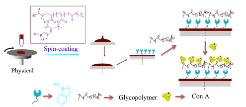 基于上述背景,復旦大學陳國頌-江明課題組以糖和鄰羥基苯硼酸半酯的動態共價鍵為驅動力,成功實現了蛋白質在QCM芯片表面的高效修飾,所得表面具有很好的穩定性。他們首先設計并分別制備了甲基丙烯酸酯和苯硼酸的無規共聚物(PtBMA-co-PBOB)和含糖均聚物,利用PtBMA與QCM芯片表面的疏水作用將苯硼酸固定在芯片表面,然后通過苯硼酸與糖之間的動態共價鍵在芯片表面修飾一層糖聚合物,最后通過糖與蛋白質的特異性相互作用將該表面用于蛋白質修飾。糖聚合物的存在和其對于蛋白質的多價結合導致芯片表面能夠高效、穩定地吸附蛋白質,固定量可達為2832 ng/cm2。而在對照實驗中,利用共價鍵修飾相同蛋白質的固定量僅為424.8 ng/cm2。所得蛋白質表面非常穩定,在大量游離的單糖沖洗的情況下,蛋白質依然保持穩定。說明通過多重非共價作用,糖聚合物能很穩定地將蛋白質固定在芯片表面。該工作對于實現蛋白質在表面的高效修飾提供了一條新的思路。
