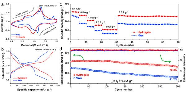 圖四 H2V3O8水凝膠和納米線的電化學性能表征