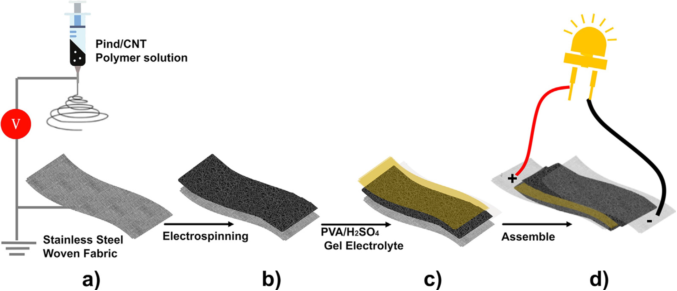 (靜電紡絲一步法制備聚吲哚納米纖維基電極并組裝柔性超級電容器示意圖)