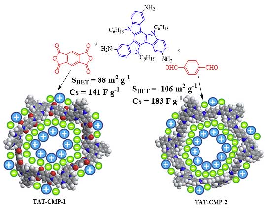 近年來,共軛聚合物備受關注,在有機電致發光(OLED)、有機太陽能電池(OPV)、有機場效應晶體管(OFET)等領域得到了廣泛的應用。然而,共軛聚合物作為活性材料在儲能器件,如超級電容器等電化學儲能領域的應用卻鮮見報道。這主要是由于現有的共軛聚合物大多比電容較低、循環穩定性不高以及氧化還原可逆性較差等,使其作為超級電容器的電極材料受到很大的限制。針對此難題,南京郵電大學黃維院士團隊的賴文勇教授課題組提出了超支化共軛微孔聚合物電極材料的設計思路,將富氮的三并咔唑單元引入超支化共軛聚合物結構中,研制了一類新結構體系的共軛微孔聚合物電極材料(TAT-CMP-1和TAT-CMP-2),實現了贗電容特性。構筑的超級電容器表現出優異的比電容行為和電化學循環穩定性,拓展了共軛聚合物在儲能器件領域的應用。
