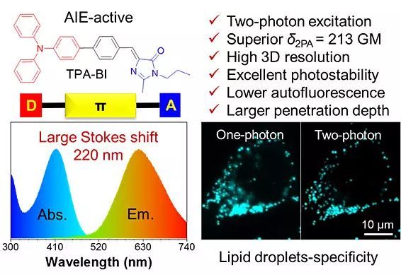 然而,這些AIE脂滴熒光探針仍然存在激發(fā)波長(zhǎng)短的問(wèn)題,導(dǎo)致在組織切片中具有較強(qiáng)的背景熒光和較低的穿透深度。為了解決這些問(wèn)題,大量的精力投入到合成長(zhǎng)波長(zhǎng)激發(fā)的熒光染料,然而成功的例子卻寥寥無(wú)幾。該方案主要面臨的挑戰(zhàn)是增大分子間共軛引起合成困難、分子量變大、分子疏水性增強(qiáng)、細(xì)胞穿透性降低、紅光量子產(chǎn)率低等問(wèn)題。另一方面,雙光子激發(fā)在生物醫(yī)學(xué)研究和臨床診斷中越來(lái)越受歡迎。雙光子激發(fā)是指物質(zhì)在強(qiáng)激光下同時(shí)吸收兩個(gè)低能量的光子(一般是近紅外光子)而從基態(tài)躍遷到激發(fā)態(tài)的非線性光物理過(guò)程。隨著飛秒泵浦激光器的商業(yè)化,雙光子激發(fā)或熒光成像越來(lái)越普及。相比于單光子激發(fā),雙光子激發(fā)具有長(zhǎng)波長(zhǎng)激發(fā)、較少的自發(fā)熒光、高3D分辨率、較少的光漂白和較深的組織穿透深度等優(yōu)點(diǎn)。若人們能將AIE特征與雙光子激發(fā)的結(jié)合起來(lái),構(gòu)建一個(gè)雙光子AIE熒光探針,便可以為脂滴跟蹤和分析提供性能優(yōu)越的生物探針,促進(jìn)脂滴相關(guān)疾病的研究。