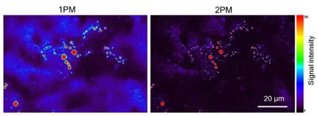 圖3. 單光子激發(fā)和雙光子激發(fā)的對(duì)比;TPA-BI應(yīng)用于組織切片中的脂滴成像,雙光子激發(fā)明顯降低背景熒光。