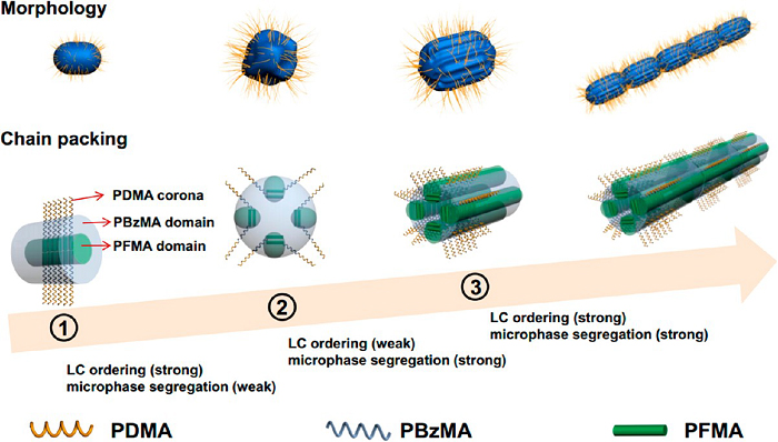 a)PDMA-b-PBzMA-b-PFMA三嵌段共聚物的合成路線;b)液晶調(diào)節(jié)的PDMA-b-PBzMA-b-PFMA組裝體在PISA過程中的形態(tài)演變的示意。