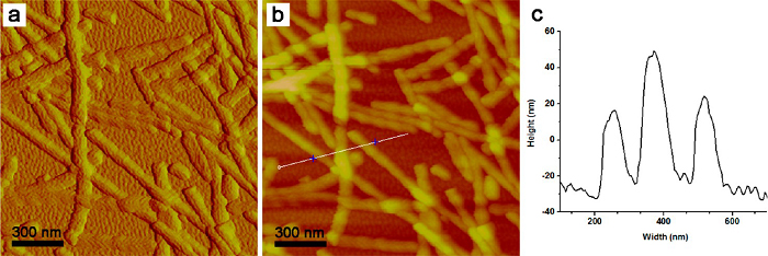 圖9 D33-B42-F44柱狀膠束的原子力顯微鏡相位圖像(a),高度圖像(b)和高度剖面(c)