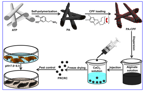課題組將凹凸棒土、海藻酸鹽等天然材料經(jīng)系列物化改性、結(jié)構(gòu)設(shè)計與功能化修飾,制備出一種納米水凝膠復(fù)合材料,并以此為載體研制出控釋農(nóng)藥。該農(nóng)藥對于pH具有較強的敏感性,可通過pH調(diào)控農(nóng)藥釋放,使釋放與需求同步,有效提高農(nóng)藥利用率。同時,該材料可顯著降低農(nóng)藥光解,延長持效期。該技術(shù)具有成本低、效率高、環(huán)境友好等優(yōu)勢,為農(nóng)藥減施增效提供了有效技術(shù)支撐,對于培育環(huán)保農(nóng)藥新產(chǎn)業(yè)提供了新途徑,具有廣闊的應(yīng)用前景。