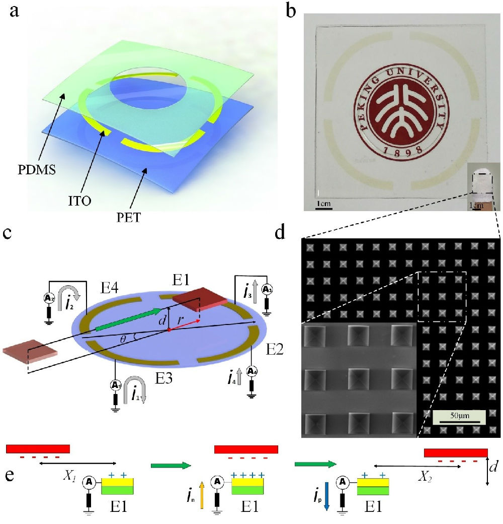 近日,北京大學信息科學技術學院微納電子學研究院張海霞教授課題組研制出一種新型的自驅動非接觸式透明柔性電子皮膚。它結合摩擦起電原理與空間靜電感應效應,利用四個電極即可達到1.5mm的二維空間分辨率。與此同時,該電子皮膚能夠檢測垂直距離不超過5cm的帶電體在平行平面內的運動,因此實現了非接觸式位置傳感。相關研究成果以《可應用于運動傳感的自驅動非接觸式電子皮膚》(Self-powered non-contact electronic skin for motion sensing)為題,于2017年12月在材料科學領域重要期刊《先進功能材料》(Advanced Functional Materials)上發表(DOI: 10.1002/adfm.201704641);信息學院2014級本科生吳瀚翔為第一作者,張海霞教授為通訊作者。