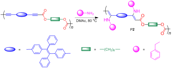 圖2. 聚炔酯的氨基-炔點擊反應后修飾路線示意圖。