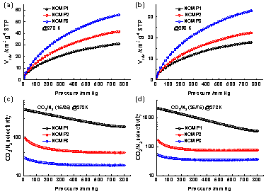 圖2. (a,b) NCMPs在273K和298K下的CO2吸附-脫等溫曲線;(c,d) 在CO2/N2混合氣體比例為15/85和25/75的條件在CO2的選擇吸附性曲線。