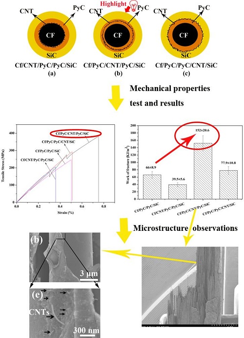 中科院寧波材料所核能材料工程實驗室(籌)近期開發出一種易操作、低成本的制備裂解碳中間層的方法。該方法以酚醛樹脂為原料,通過浸漬裂解碳法在碳纖維表面均勻涂覆裂解碳層。與此同時,該方法還利用碳納米管增強中間層得到了新型的多層次碳化硅復合材料,揭示了不同納米、微米對復合材料力學性能以及微觀結構的影響,復合材料中間層設計如圖所示。