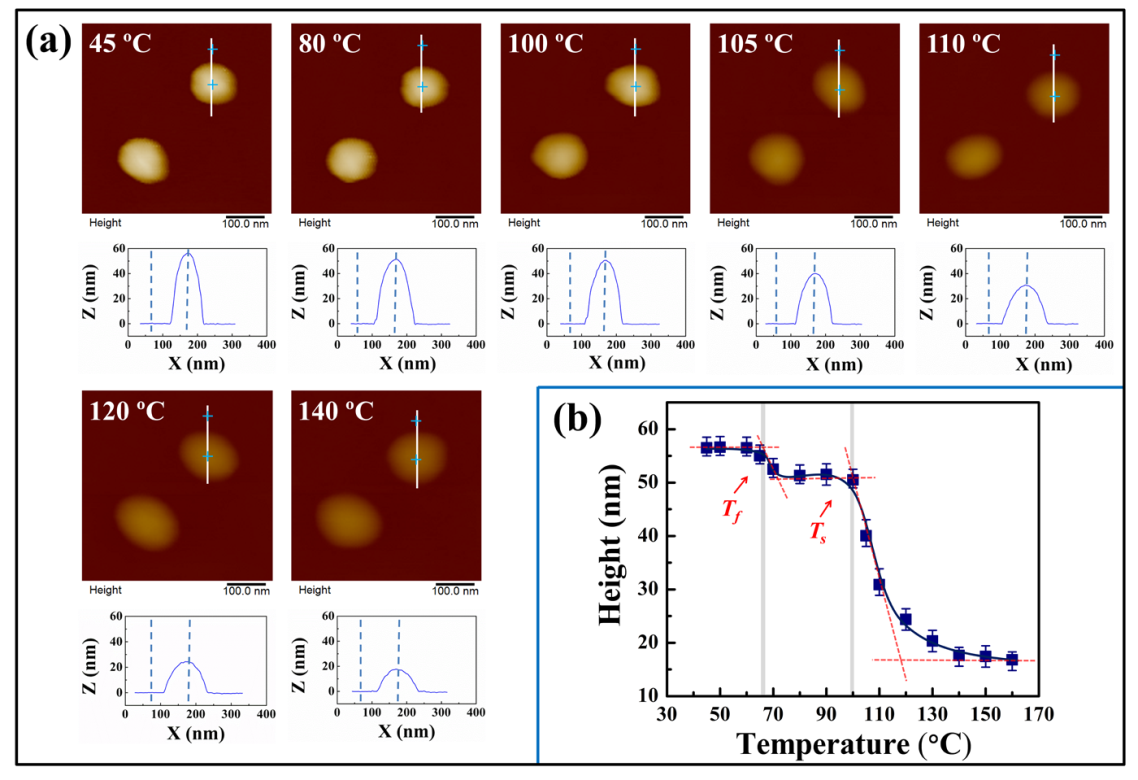 并且通過調(diào)節(jié)膠束制備條件以及嵌段共聚物各組分聚合度,制備了一系列不同粒徑、核密度、殼層厚度的高分子膠束。利用原子力顯微鏡(AFM)研究原位升溫過程中膠束尺寸變化,發(fā)現(xiàn)隨溫度升高,膠束存在兩個明顯的塌縮過程(圖2)。進(jìn)一步通過AFM相圖中相位角隨溫度的變化(圖3)研究膠束力學(xué)性能的演變,發(fā)現(xiàn)兩個轉(zhuǎn)變溫度Tf和Ts分別對應(yīng)著PAA與PS鏈段松弛的溫度。